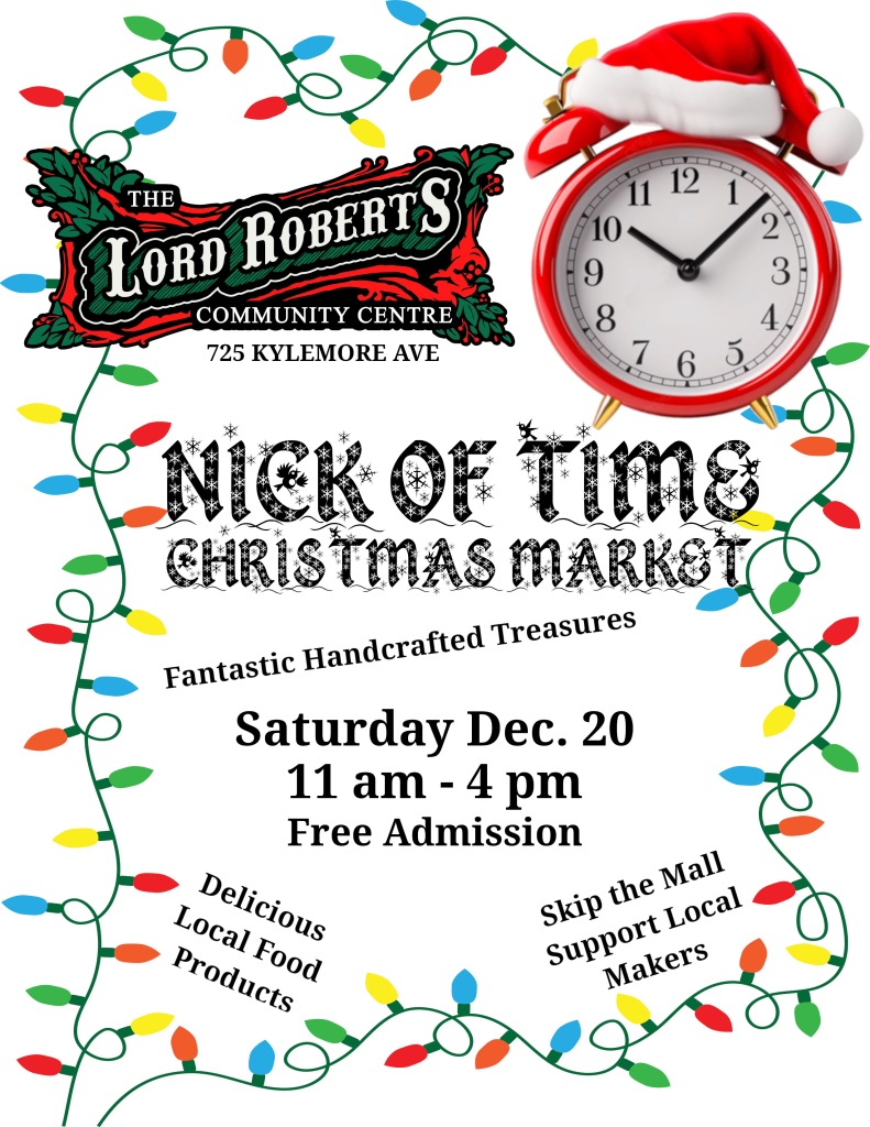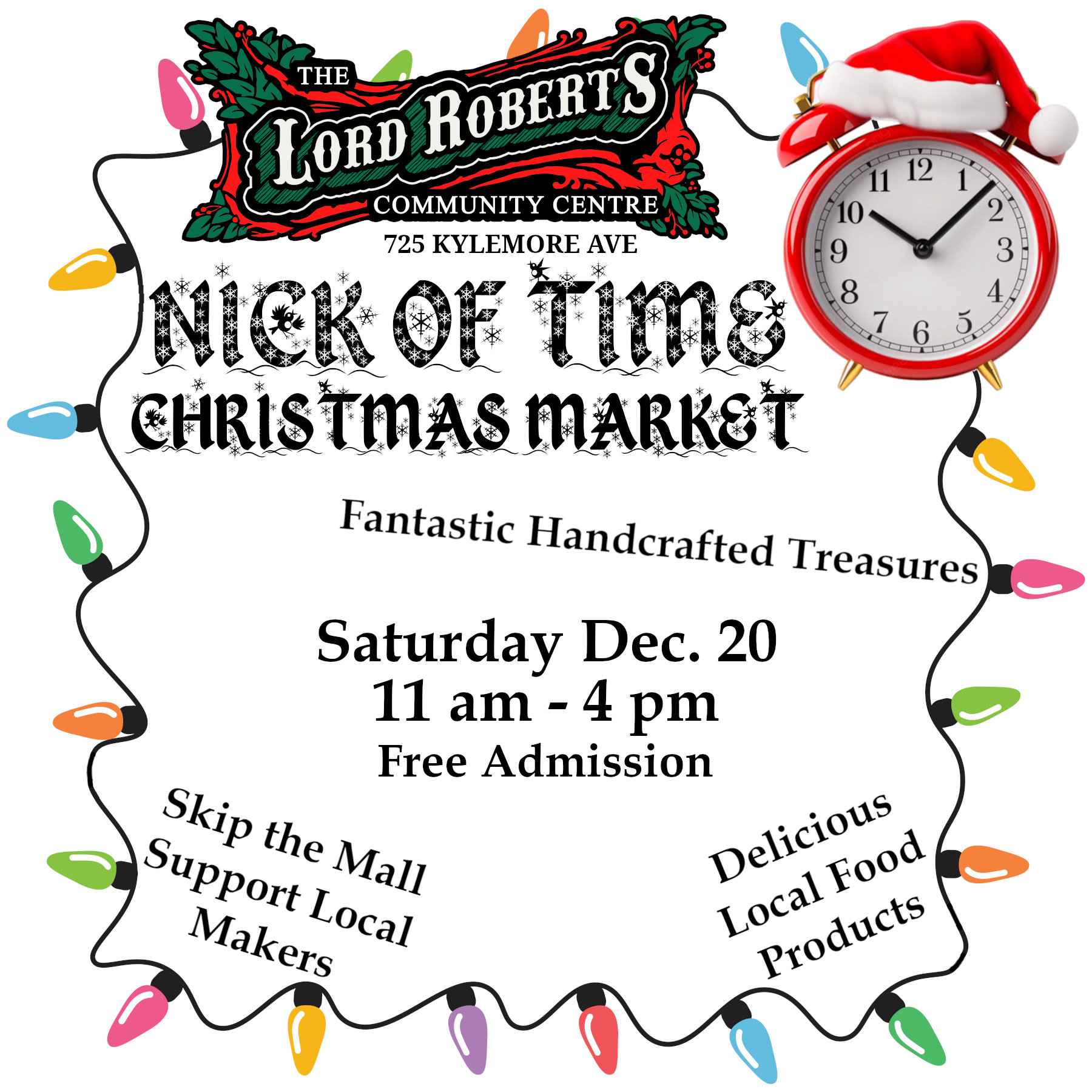 Events Nick of Time Christmas Market Find homemade crafts/gifts from popular vendors at this year's Holiday Market. Join us at the Nick of Time Christmas Market, on Saturday December 20th from 11am to 4pm.